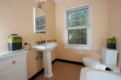 Built-ins - Hex tile floor - Tub - Pedestal sink |