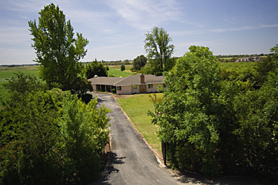| Front yard & drive - Estate gates - Parking area | Backyard view - Large patio - Shade trees |